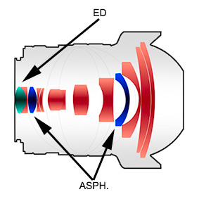 das Objektiv hat 14 Elemente in 9 Linsengruppen (davon 2 asphärische Linsen und eine ED Linse)