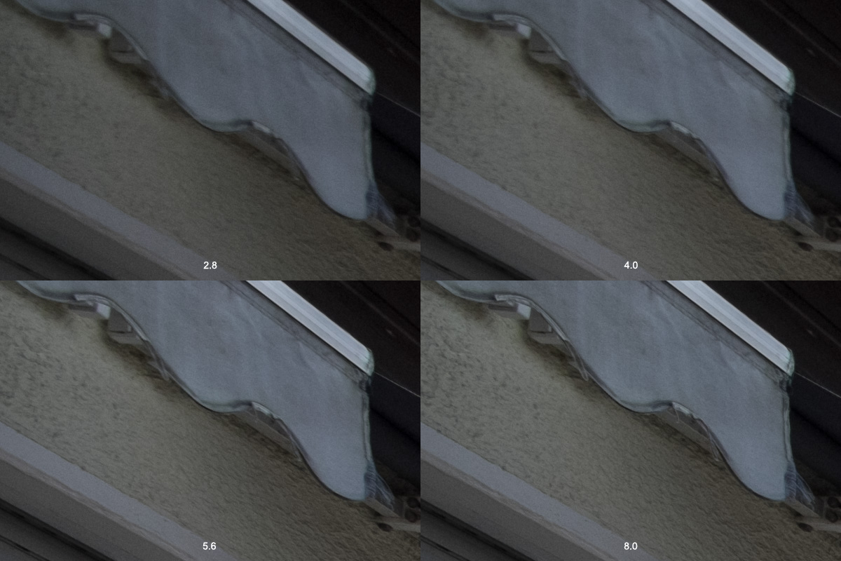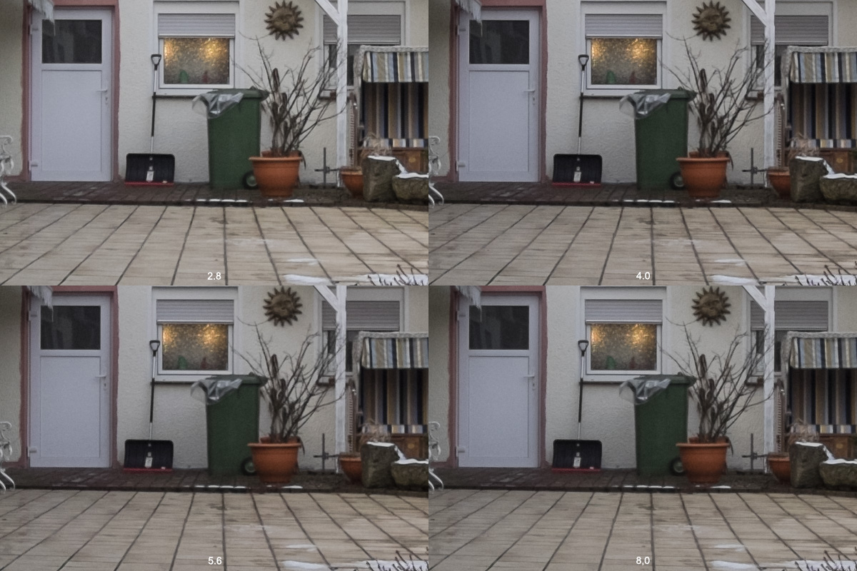 Im Zentrum ist es bei Offenblende schon ausreichen scharf, ab Blende 4 knackscharf. An den Rändern sieht es da anders aus. Da ist es ab Blende 4 brauchbar und ab Blende 8 scharf.