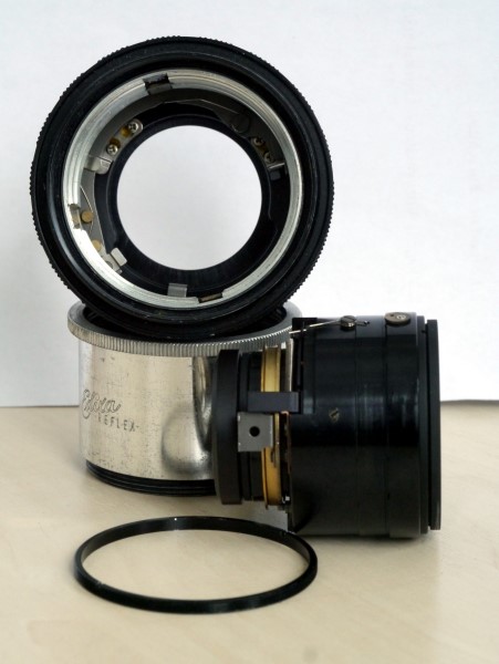 An die Blendenlamellen kommt man einfach durch ausschrauben der vorderen und hinteren Linsengruppen. Bei mir waren die Lamellen selbst sauber, aber der Rücksteller, der die Blende wieder öffnet, war sehr träge. Um mir späteres rumgepfriemel mit einzelnen Lamellen und eventuellen Ungleichmässigkeiten wegen dezentrierter Fassung (die drei Schlitzschrauben von aussen die die Lamellenhalterung halten) zu vermeiden, habe ich das ganze Teil im Ultraschallbad mit Reinigungsbenzin gereinigt. Danach gut und lange trocknen lassen, damit auch das Benzin aus den Ritzen ausdunsten kann. Schneller gehts auf der warmen Heizung.