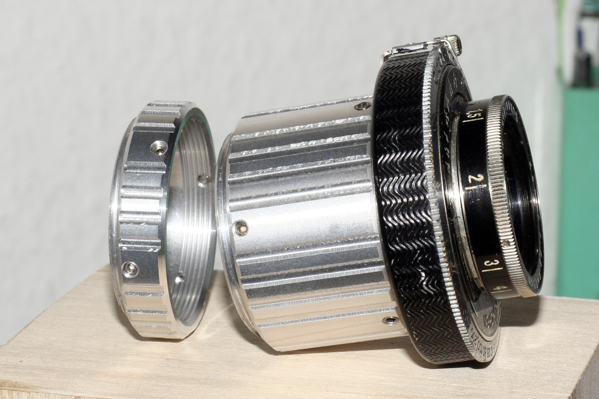 Dieser bringt dann einerseits die Brennweiten um die 75-80mm in den ungefähr notwendigen Arbeitsabstand...(feinjustage nachher über die Einschraubtiefe mit und in den Verbindungsmuttern) und ermöglicht zusammen mit den Wandlerplatten M25, M27, M30 oder 32.5 den Anschluss solcher Objektive...