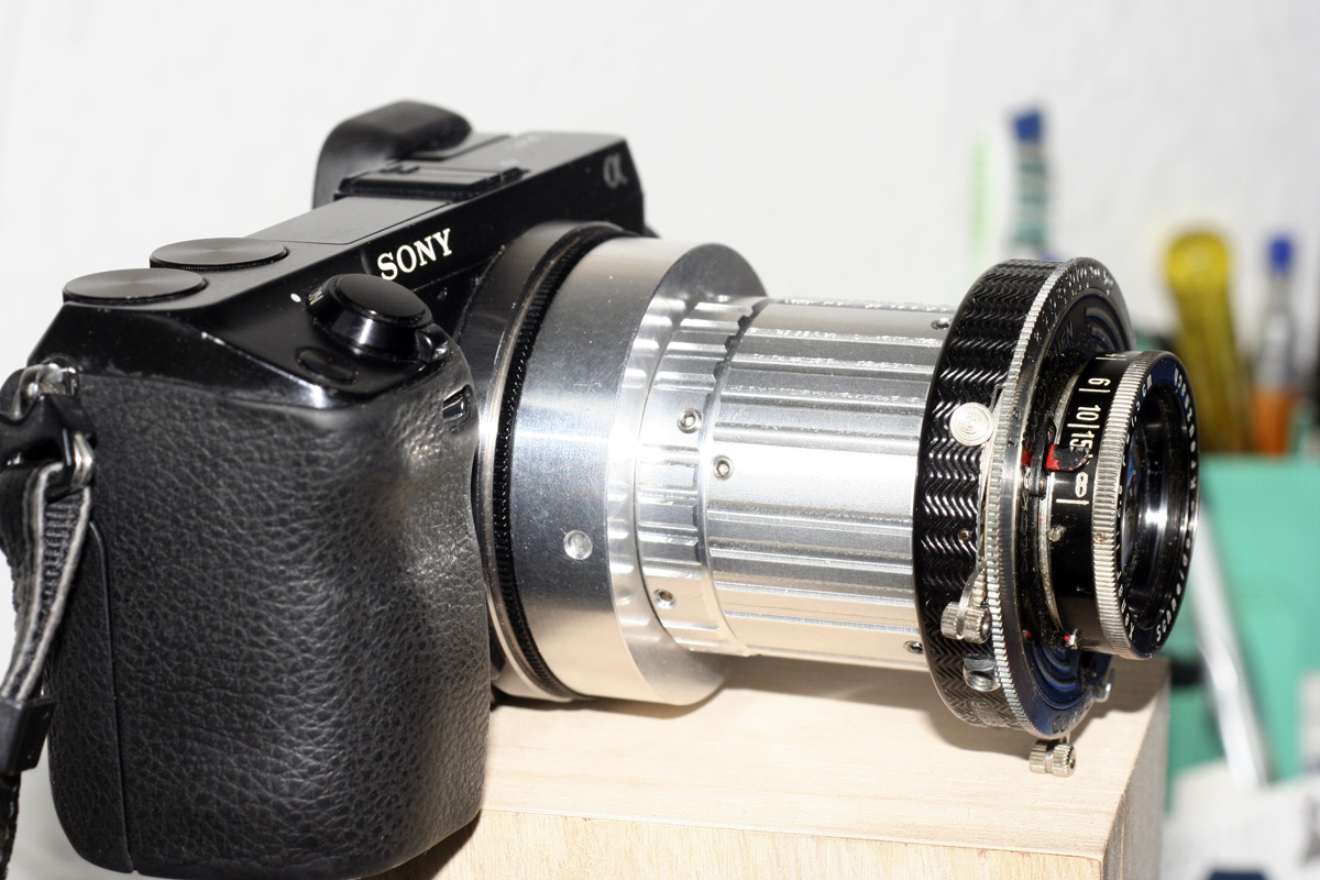C-Mount-Nex Adapter: Das Objektiv lässt sich nur von der NEx-Bajonett-Seite einschrauben. Nun habe ich vor, diesen Adapter in einen Filter-Adapter zu kleben und dann mit Step-Up-Ringen an einen M42-M42-Focusing Helicoid (17-33mm) zu schrauben und diesen dann über einen M42-NEx-Adapter an die A7.