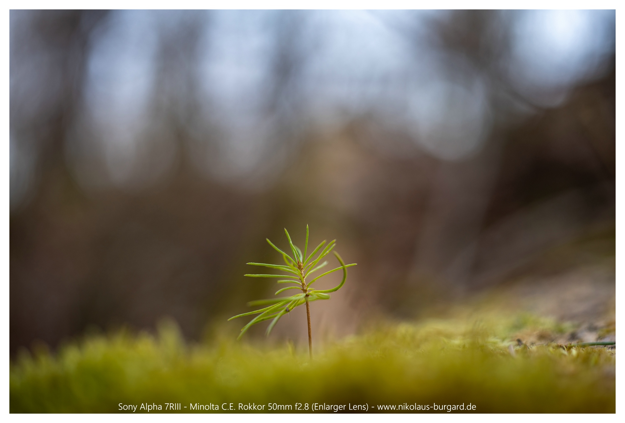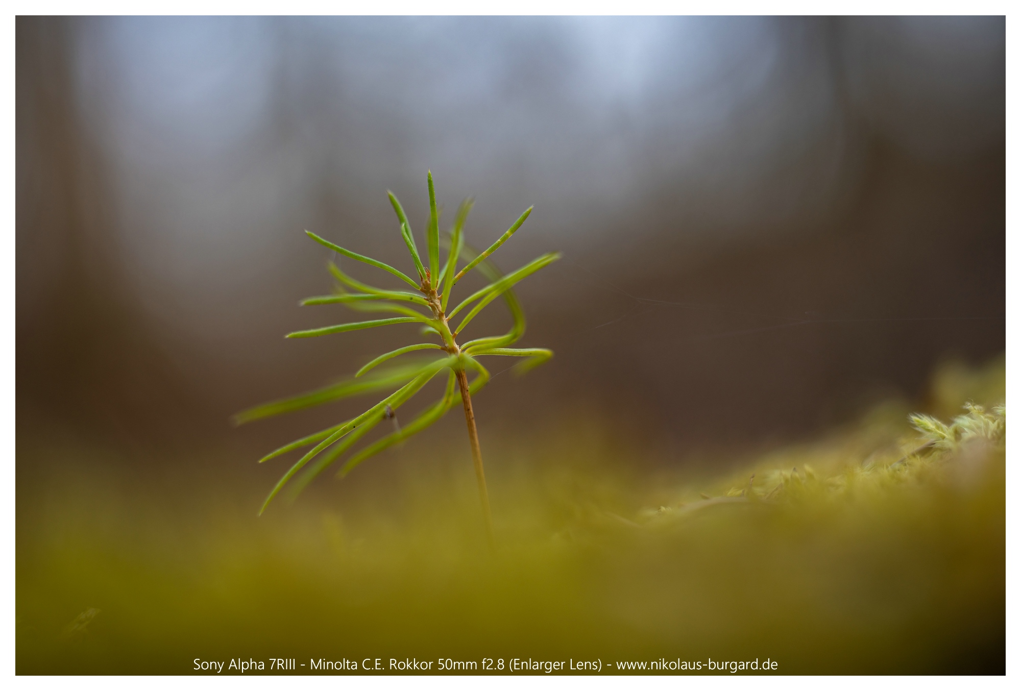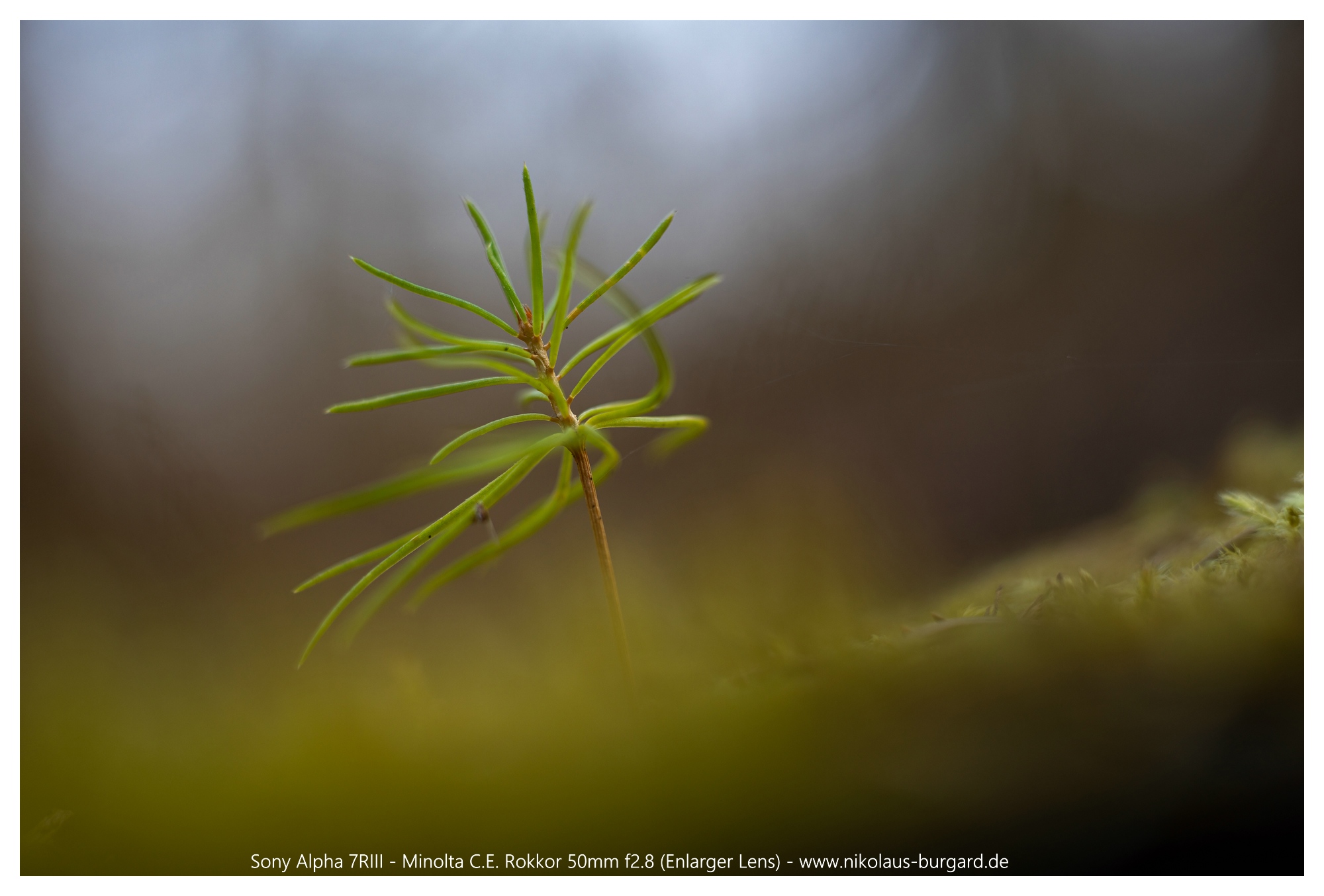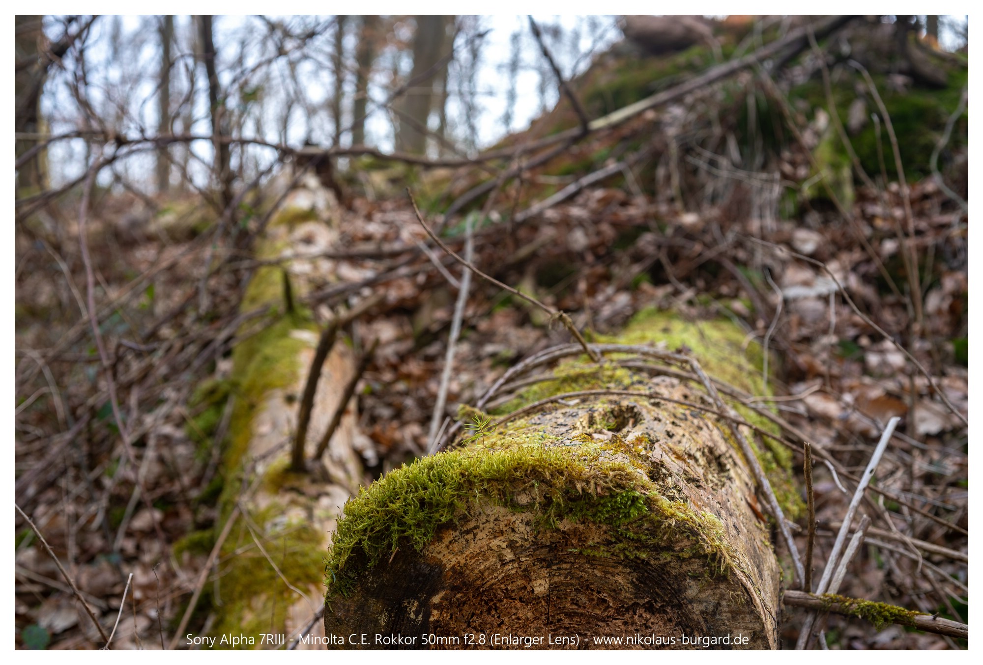Zuerst zum Überblick die "Situation". Ziel war der Nadelbaumwinzling, der aus dem Moos auf dem gefällten Baum erwächst: