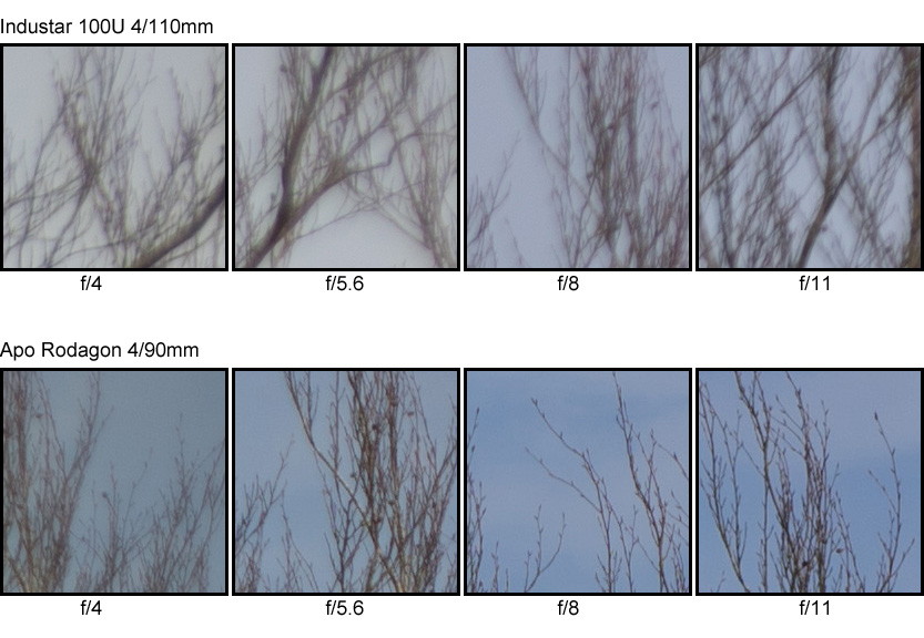 Auch hier zeigt sich, dass die Schärfe in der Bildmitte hervorragend ist. Das Randschärfeproblem zeige ich einmal anhand des direkten Vergleiches mit dem Apo Rodagon 4/90mm in der folgenden Grafik (Ecke rechts oben):