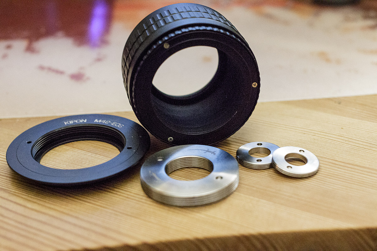 Dass es nicht um die EOS M geht, ist mir schon aufgefallen. Mit ausgebauter Lochblendenaufnahme sieht das Teil (neben einem M42-EOS-Adapter) so aus: