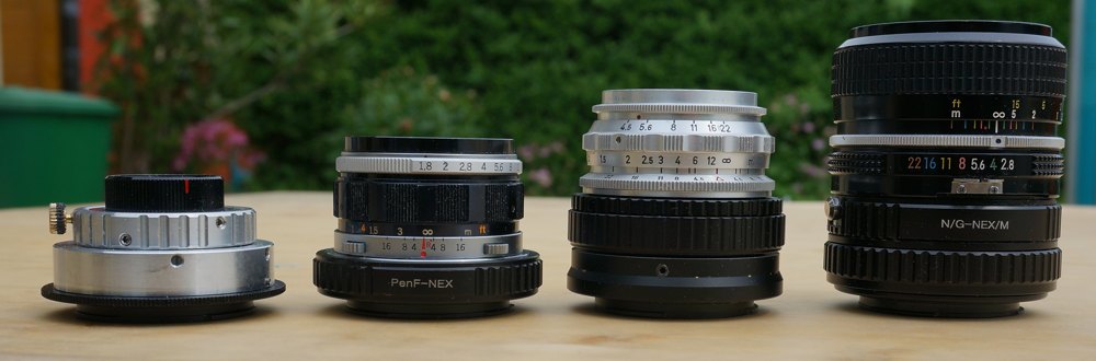 Hie mal ein Größenvergleich mit den jeweiligen Adaptern für das Sony-Bajonet, von links Vivitar 35_3,5 Olympus 38_1,8 Steinheil Culmigon 35_4,5(M42) und Nikon AI 35_2,8