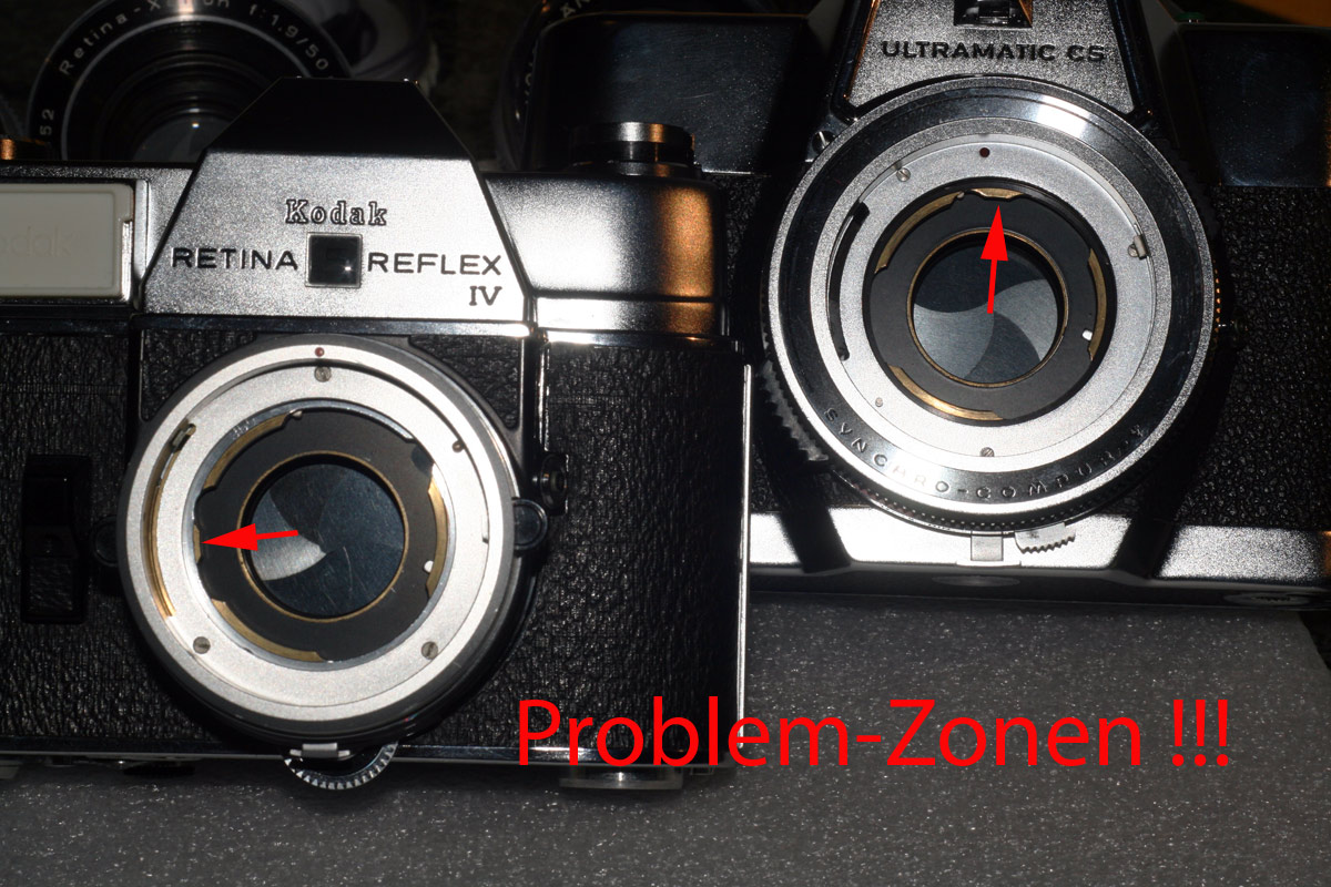 Bei der Verwendung der Retina Objektiven stört die mit dem oberen Pfeil gezeigte kleine "Nase/Spitze", die man am rechts im Bild befindlichen Anschluss eines Voigtländer Objektivs sehen kann.