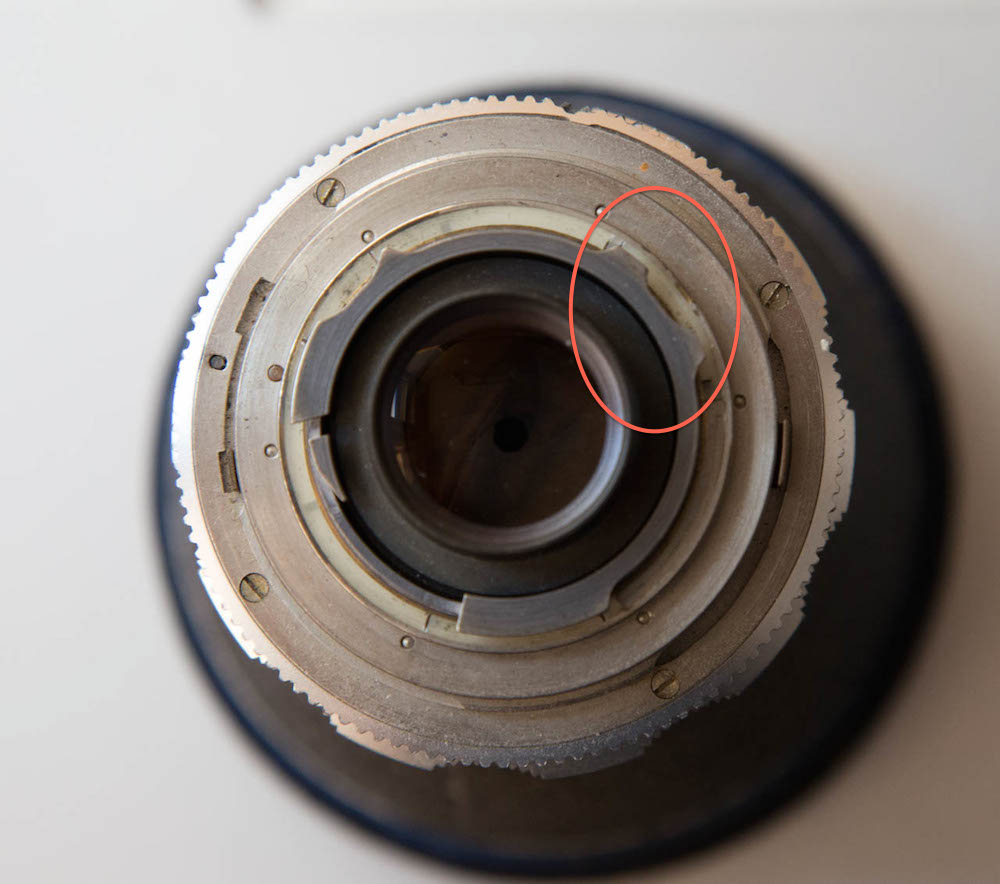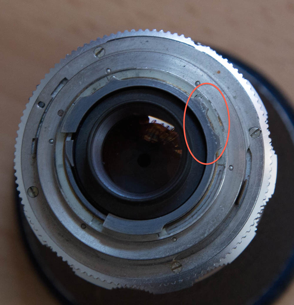 Das Einzige, was man tun muss um ein Objektiv der Bessamatic an einer Retina verwenden zu können, ist eine kleine Kerbe an der markierten Stelle in das Bajonett der Bessamatic Objektive zu feilen.
