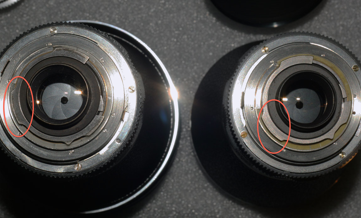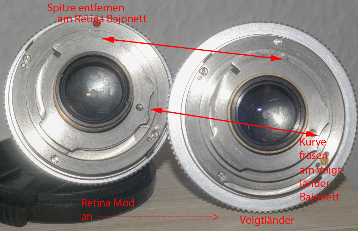 Der untere Pfeil zeigt den Mod, den RetinaReflex hier bereits geschildert hat, denn das rechts im Bild gezeigte Voigtländer hat schon diese "Einfräsung".
