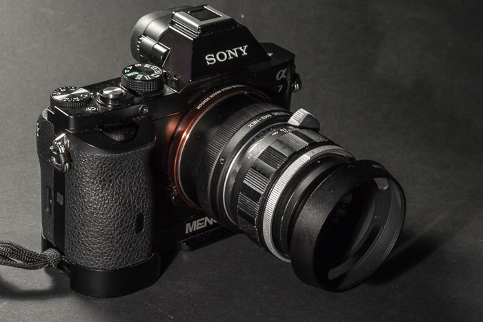 Und so sieht das an der Sony A7 aus, mit M42-Adapter und 43mm Streulichtblende an einem 46mm-43mm Step down Ring (vignettiert nicht).