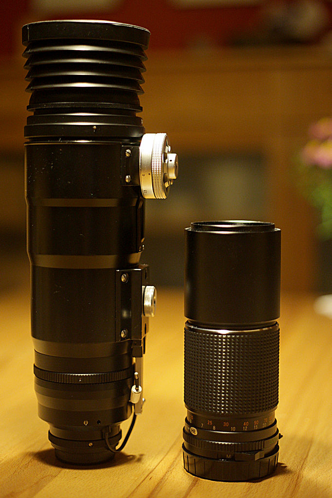 Das Mamiya wirkt fast zierlich, allerdings müßte man fairerweise beim Tair die Gegenlichblende abschrauben.