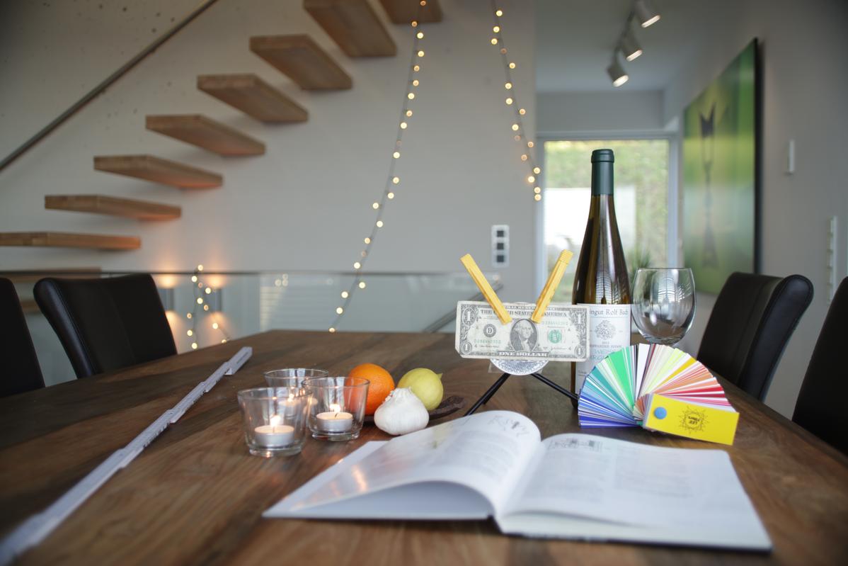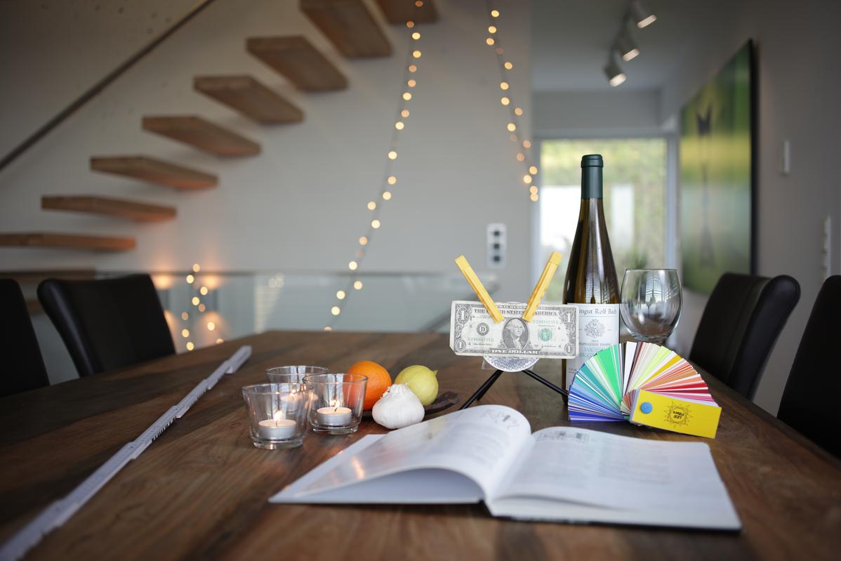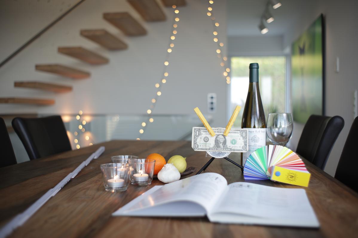 Der Geldschein selbst liegt in seiner gesamten Fläche nur ungefähr parallel zur Sensorebene. Ebenso befinden sich die platzierten Gegenstände nicht zwingend in der Schärfeebene bzw. im Schärfekonus. Die Weinflasche befindet sich z.B. absichtlich etwas hinter der Schärfeebene, um den Übergang beurteilen zu können.