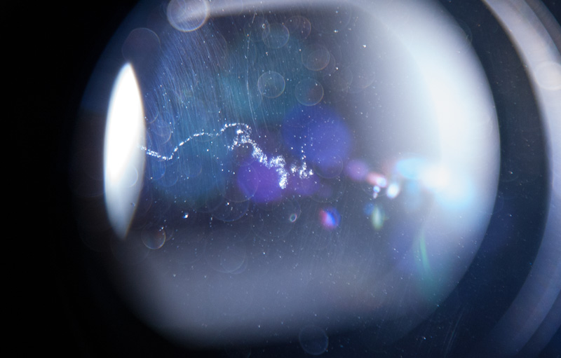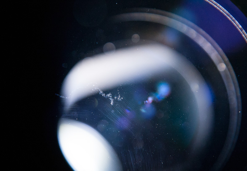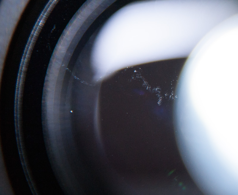 Ich glaube nicht an den Schimmel, es koennte auch ein Kratzer sein. Man sieht auch Unterbrechungen. Und interessant die Schleifspuren auf der Linse gleich darunter. Jedenfalls fuer mich kein Grund gewesen, das Geschenk zurueckzusenden. Und selbst wenn hier der Fungus zart heraufgrinst aus dem Glassee, er wird wohl kaum die Sicht fuer immer trueben. Denn hier ist es trocken, die mitgelieferte Abdeckhaube abgenommen und das schoene Hammergeschlagene steht auf meinem Schreibtisch, damit es Luft und Licht empfaengt.