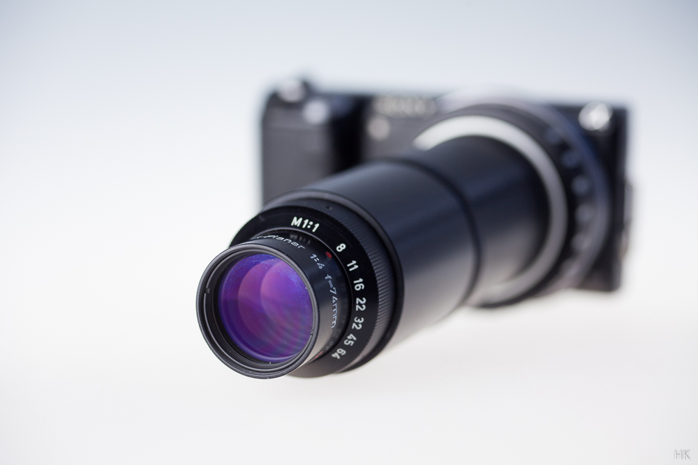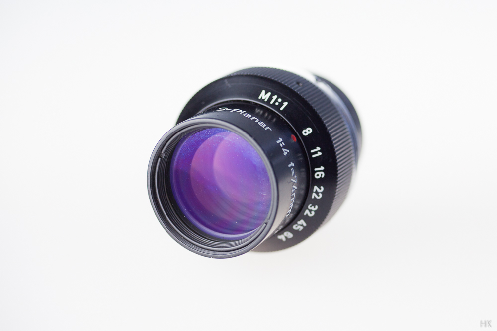 Das Objektiv ist mit einem etwas ungewöhnlichen M32x0.5 Gewinde versehen und lässt sich mit einer entsprechenden Wandlerplatte problemlos an das VNEX-System adaptieren. Nachdem ich aber feststellen musste, dass man dort noch einiges an Zwischenstücken benötigt, um auf 1:1 zu kommen und mir das ganze zu wackelig wurde, ziehe ich momentan eine andere Lösung vor: Ich habe zwei 50mm-M39-Zwischenringe als "Makrotubus" genommen und das S-Planar mit der Wandlerplatte direkt dort hineingeschraubt. Das ergibt ziemlich exakt Maßstab 1:1 und das "Fokussieren" mache ich dann statt mit einer Fokusschnecke über eine Makroschiene, auf der die Kamera sitzt - finde ich eh komfortabler für Makros.