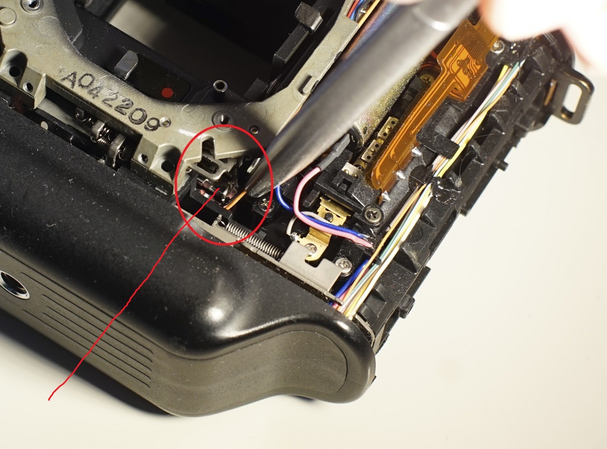Das ist der Übeltäter. Am besten Stellt man die Kamera auf H, Dauerfeuer und ärgert den Magneten mit einen Magnetisierten Schraubenzieher. Ruhig ein wenig um den Magneten rum gehen ( vorsicht mit den 2 Kabeln) und auch den Magneten berühren oder mal rechts neben den Magneten vorsichtig rumstochern. Dann erschreckt ihr euch warscheinlich :lol:. Der Verschluss der T90, wenn sie auf dem Tisch liegt, ist sehr laut :lol:. Dann einfach Dauerfeuer, 5 min Pause Dauerfeuer, 30min Pause, Dauerfeuer usw. Am nächsten Tag noch ein Paar mal Dauerfeuer. Meine T90 hat seitdem ( 8 Monate) keinerlei Probleme gemacht. Sollte sie doch irgendwann mal Probleme machen Einfach nochmal den Verschlußmagneten Checken.