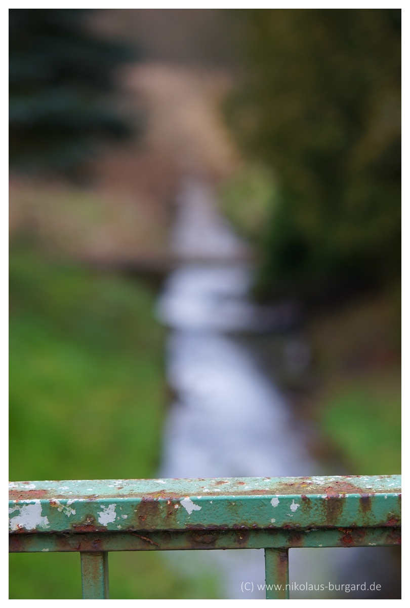 Los geht's mit dem "Bokeh"-Bach: 1. Bild aufs Geländer fokussiert, das Bokeh verläuft traumhaft - ohne herausstechende Highlights oder Doppelkonturen - toll!