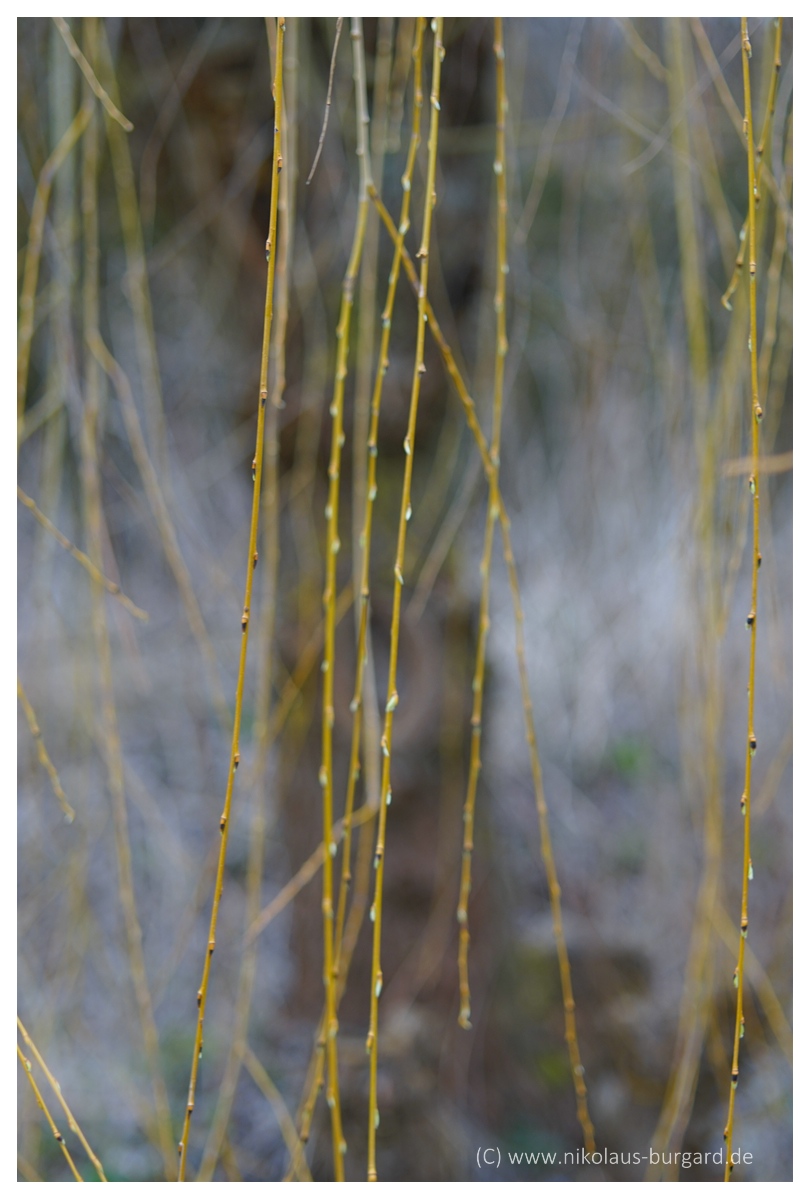 Als nächstes ist der Weidenbaum dran. Beim 1. Bild liegt der Fokus auf dem Astloch - die Weiden im Vordergrund werden sehr schön weich geszeichnet. Beim 2. Bild habe ich auf die Weiden im Vordergrund fokussiert - schönes Bokeh bei nervösen Strukturen.