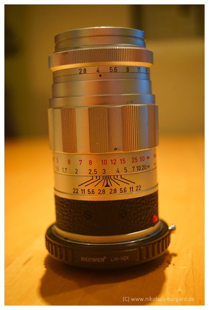 Ich adaptiere das Objektiv mittels eines L/M-Nex Adapter von Neewer an die Sony Alpha 7 II, der Test ist also am Kleinbildformat.
