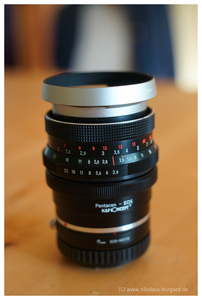 Weg der Adaptierung an die Sony Alpha 7 II: Pentacon Six-EOS-Adapter, dann EOS auf Nex Helicoid-Adapter.