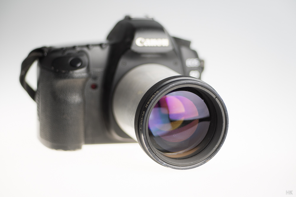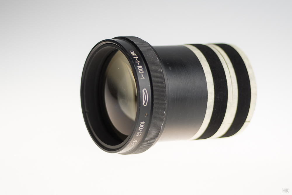 Und wieder einmal ein russisches Projektionsobjektiv mit 62.5mm-Tubus und insofern ziemlich sicher zu einem Kinoprojektor (35mm-Film) gehörend und mit Henry's Samtfokussiertubus in der passenden Größe schön komfortabel adaptierbar: Es hört auf den etwas sperrigen Namen 0KP-1-100-1 und hat eine Blende/Lichtstärke von f/1.8 bei einer Brennweite von 100mm.