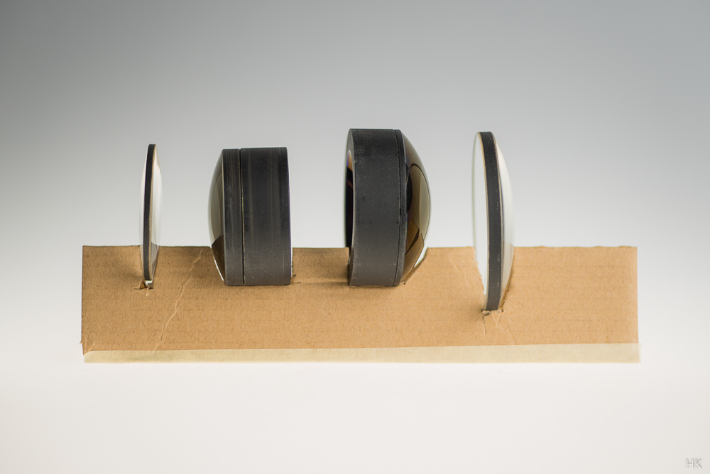 Die Frontlinse (rechts) ist konvex/konkav und insofern sieht das für mich eigentlich nach einem Planar-Schema aus, auch wenn hinsichtlich der Gesamtabmessungen einiges an das Biotar-Schema erinnert, das Henry bei dem Meopta Meostigmat 1.4/70 erkannt hat (s. http://www.digicamclub.de/showthread...l=1#post207438). Übrigens ist die farbig schillernde Mehrfachvergütung interessanterweise nicht auf der Frontlinse aufgebracht sondern auf der Vorderseite des zweiten Elements - welchen Sinn das ergibt, zumal bei einem Projektionsobjektiv, erschließt sich mir nicht so ganz.