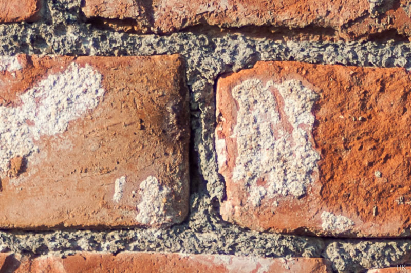 Bei solchen zweckentfremdet genutzen und adaptierten Projektionsobjektiven stellt sich für mich immer zuerst die Frage: Ist das eher ein reines "Effektobjektiv" zum Spielen oder kann man es auch als seriöses optisches Werkzeug nutzen. Im Falle des 0KP 1.8/100 sehen die ersten Eindrücke deutlich nach dem zweiten Fall aus. Natürlich muss man mit einigen Kompromissen rechnen, aber das ist bei einem nicht abblendbaren so lichtstarken Objektiv im Bereich von Portraitbrennweiten auch nicht anders zu erwarten. So sieht das Testbild an der Ziegelmauer aus (alle Bilder an der Canon 5D MkII, KB-Format, ca. 21 MPx):