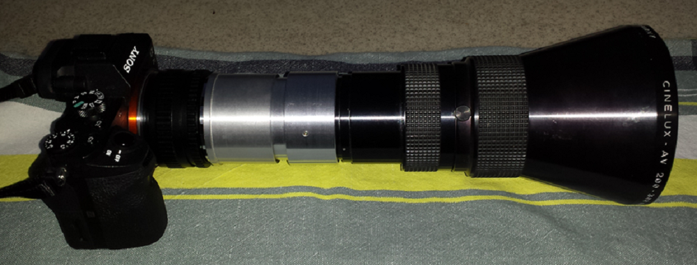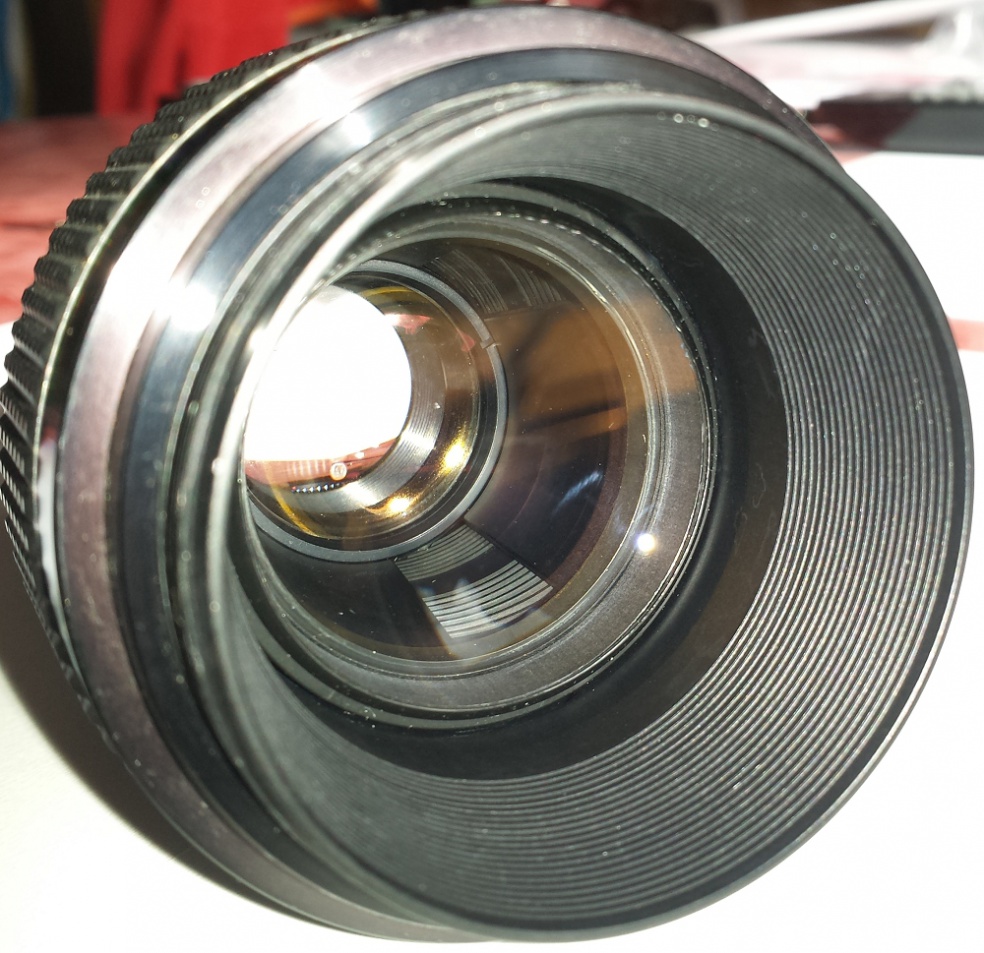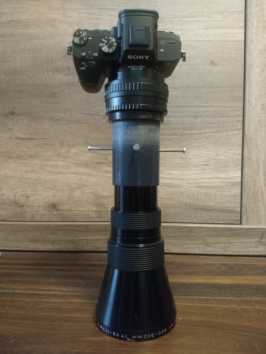 Den M65 Helicoid inkl 62,5 mm Aufnahme hatte ich schon für andere Projektionsobjektive. Dann habe ich mir aus dem Teichbedarf ein 63mm Rohr gekauft, auf der einen Seite so viel abgefeilt, bis es nur noch 62,5mm waren (Sieht leider etwas unordentlich aus). Das Objektiv nimmt in der Breite zu. es gibt eine Stelle, die fast genau in den Innenraum des Rohrs passt. Daher habe ich das Rohr am Eingang mit etwas schwarzem matten Klebeband ausgeklebt, so dass es genau passte. Wegen des Gewichst des Objektivs reichte eine einfache Fixierung durch das einpressen an einer Stelle allerdings nicht. So habe ich 4 Löcher etwas weiter hinten in das Rohr gebohrt, von innen 4 kleine Muttern gesetzt und halte das Objektiv jetzt mit 4 Schrauben jetzt dort noch einmal zentriert fest. Die Schrauben momentan sind leider noch etwas lang. Die 10mm Schrauben waren etwas zu kurz und etwas dazwischen hatte ich gerade nicht - wird aber noch getauscht.