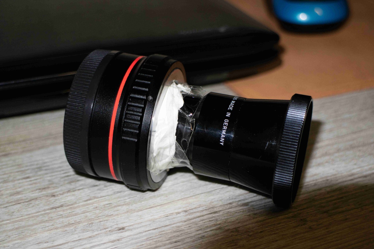 Da es mir keine Ruhe gelassen hat, habe ich mal einen M42-Adapter für meine M3 rausgekramt und unter Verwendung hochwertigster Materialien aufwändig :devil:zum Q&D-Adapter umgebaut: