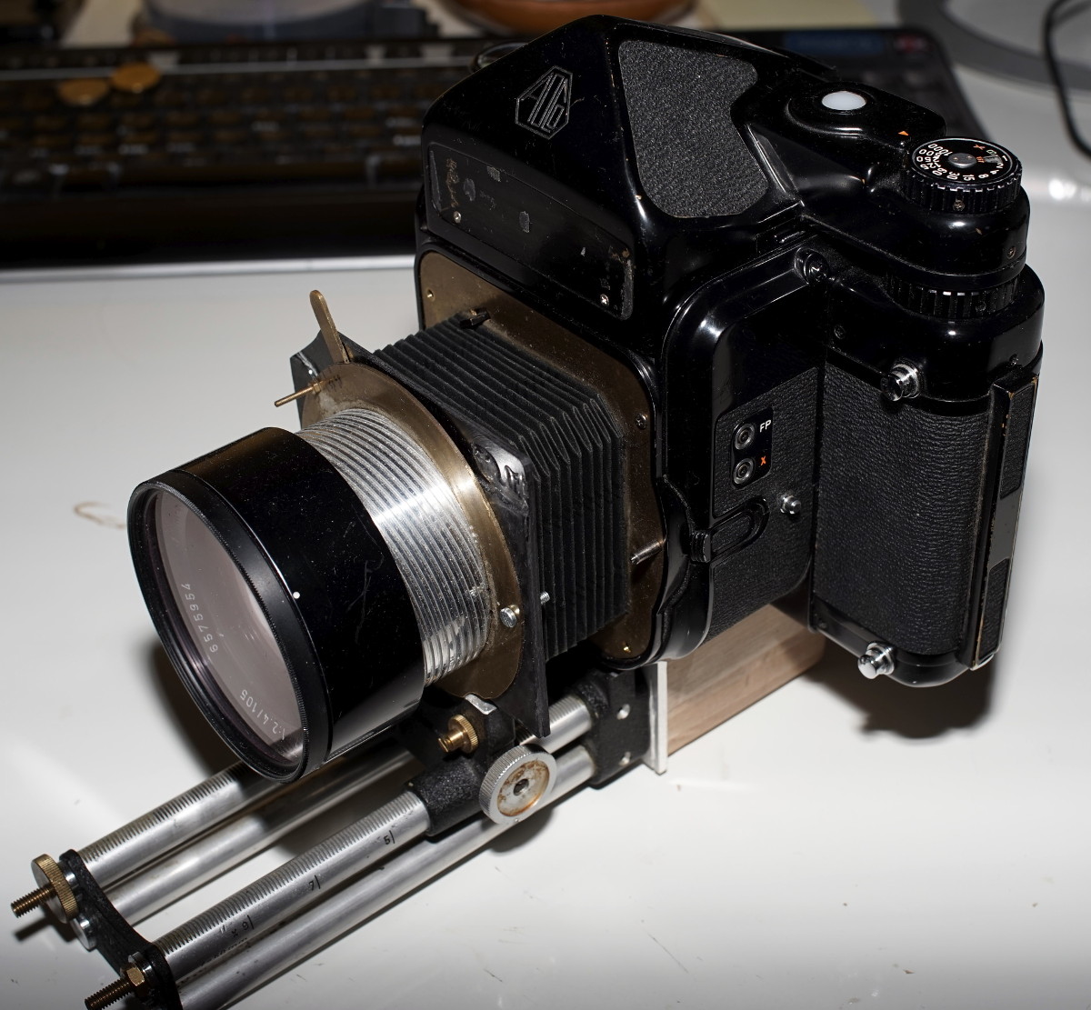 Auf dem Balgengerät wurde eine 3mm dicke Sperrholzplatte geschraubt, an der dann das 105mm Takumar geschaubt wurde.