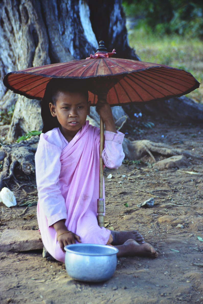 Bei der buddhistischen Nonne handelt es sich um ein etwa sechs bis acht Jahre altes Mädchen. In dem Alter gehen alle burmesischen Kinder für eine Woche ins Kloster, und in der Zeit müssen sie auch am Straßenrand mit einem Topf um Essen oder Geld bitten.
