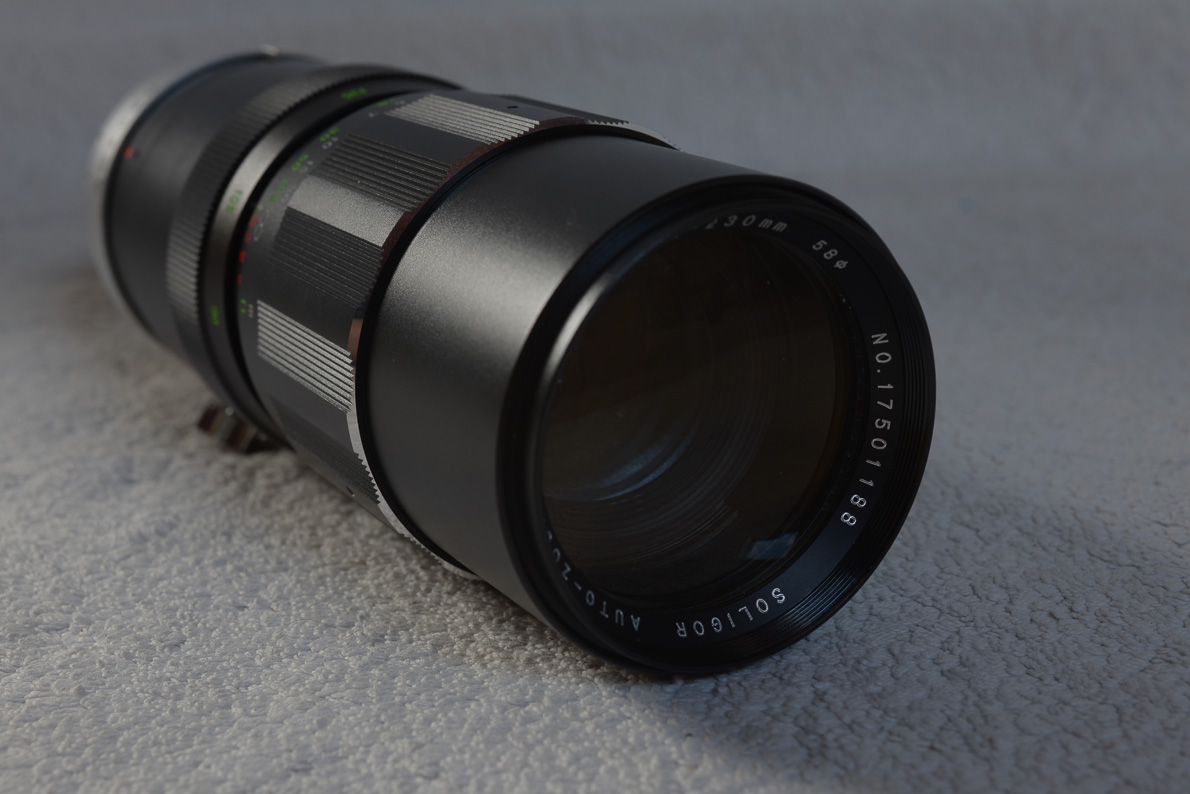 Heute möchte ich euch meine neueste Erwerbung vorstellen, ein Soligor 90-230/4,5. Die Seriennummer weist es als von Tokina gebaut aus, und Vivitar hatte es wohl auch im Programm gehabt. Gekostet hat es zwölf Euro, und das auch nur, weil der Verkäufer so klug war, einen Mindestpreis in der Auktion festzulegen, sonst hätte es vermutlich für den halben Preis den Besitzer gewechselt. Die alten manuellen Zooms will heutzutage niemand mehr haben.