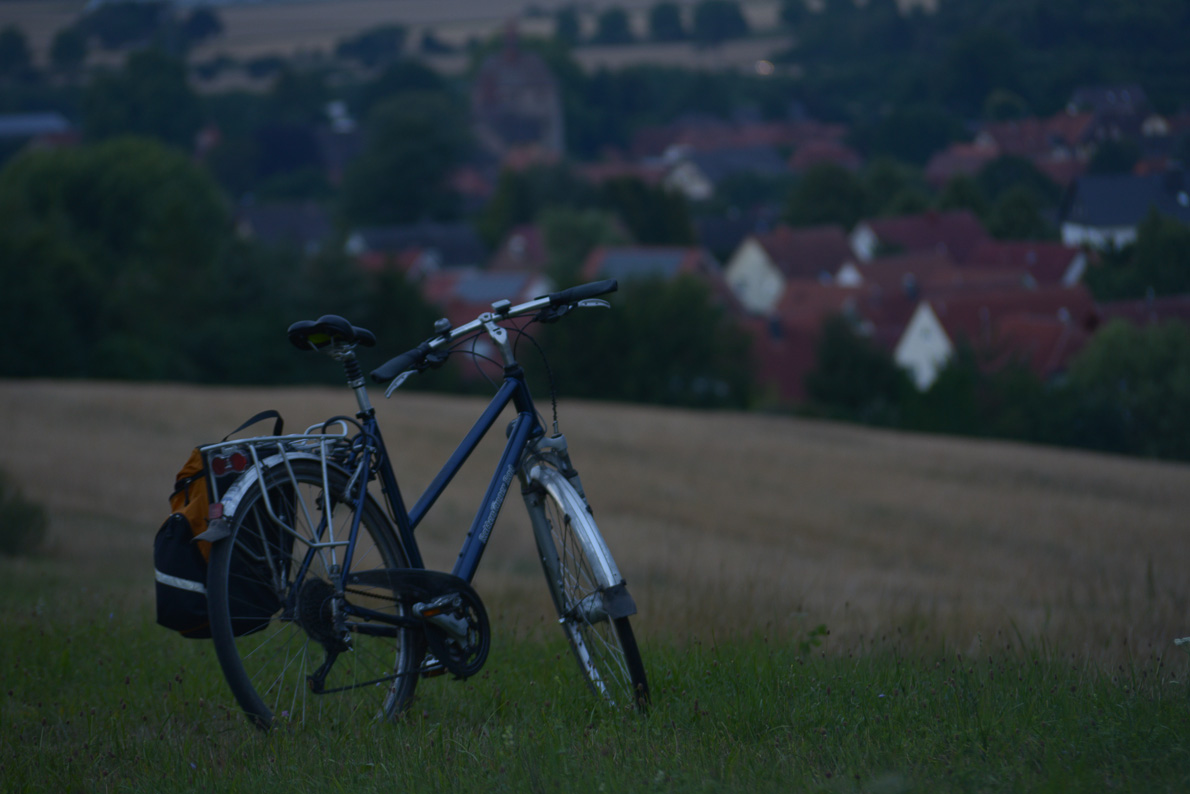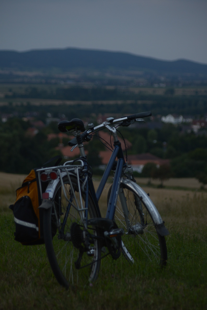 Offenblende bei 90mm, Fokus auf der Gabel des Vorderrades, ca. eine halbe Stunde nach Sonnenuntergang: