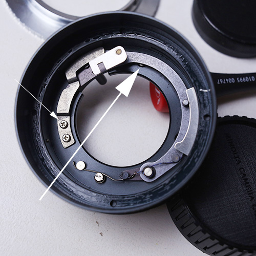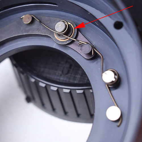 Im inneren des Mount deckels befindet sich die Blendenmechanik. Verdeckt darunter sind 3? schrauben die den Mount befestigen? (einer zu sehen im Bild rechter pfeil). Diese lösen um diesen freizugeben? Wenn ja wie mache ich es am besten? An zwei schrauben komme ich ran wenn ich die Blendenmechanik verstelle. der dritte liegt unter einen teil der Blendenmechanik den ich lösen muss (zwei schrauben im bild linker pfeil) ist das alles korrekt?