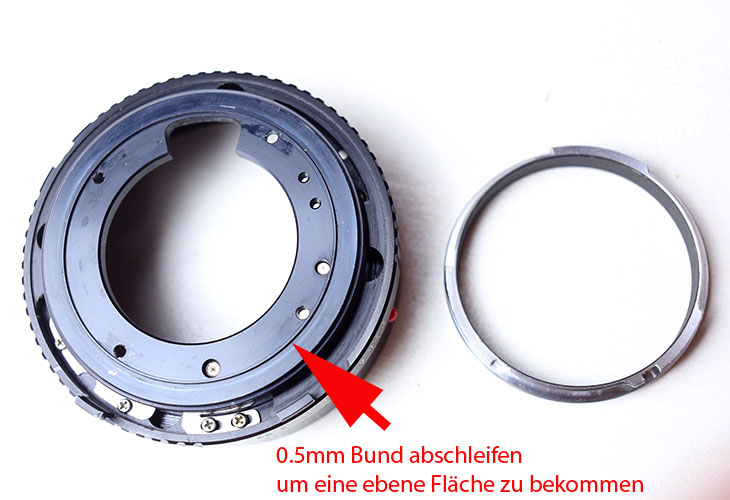 Beim Übertragen der notwendigen Bohrpositionen sich die Lageverhältnisse - insbesondere die spätere 12 Uhr Stellung der Skalen - klarmachen und aus PB Adapter und Objektivrückteil ein "Sandwich" bilden.