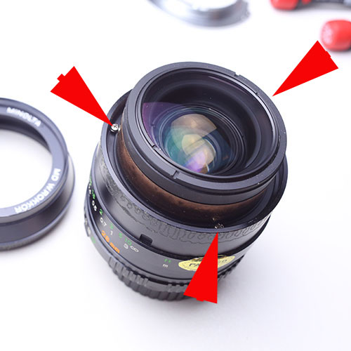 Löse erst dann die Schrauben und halte die vordere Linsengruppe fest, während Du den Fokusring dann auf 3 Meter verstellst und die Schrauben wieder anziehst.