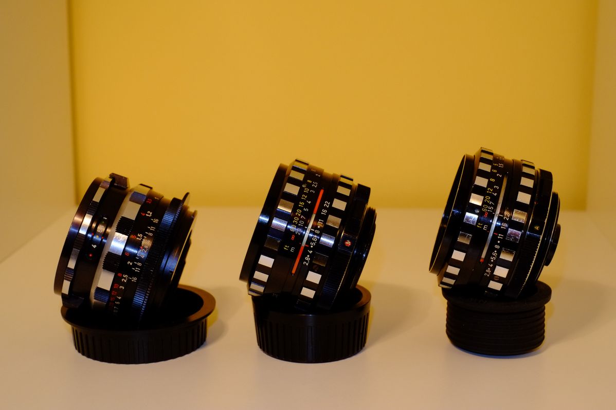 Von der Seite Version 2, 3 und dann der "kleine Bruder" das 2.8/35mm als Zebra mit 6 Blendenlamellen: