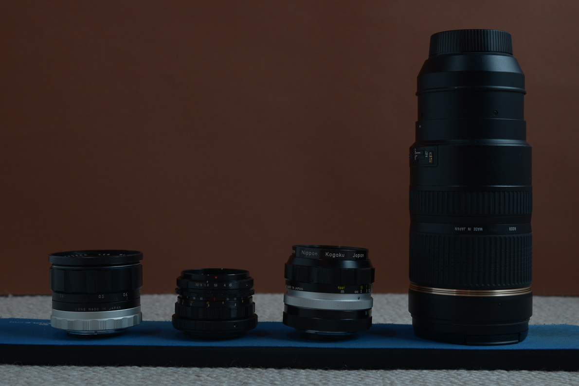 Hier ein Größenvergleich, von links Soligor 28/2,8, dann dieses Soligor 35/3,5, daneben Nikkor 35/2 und als letzten das Tamron 70-200/2,8.
