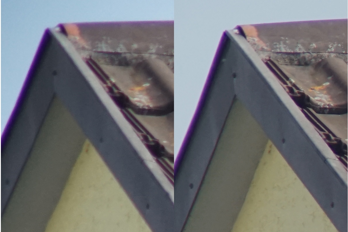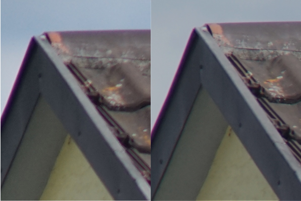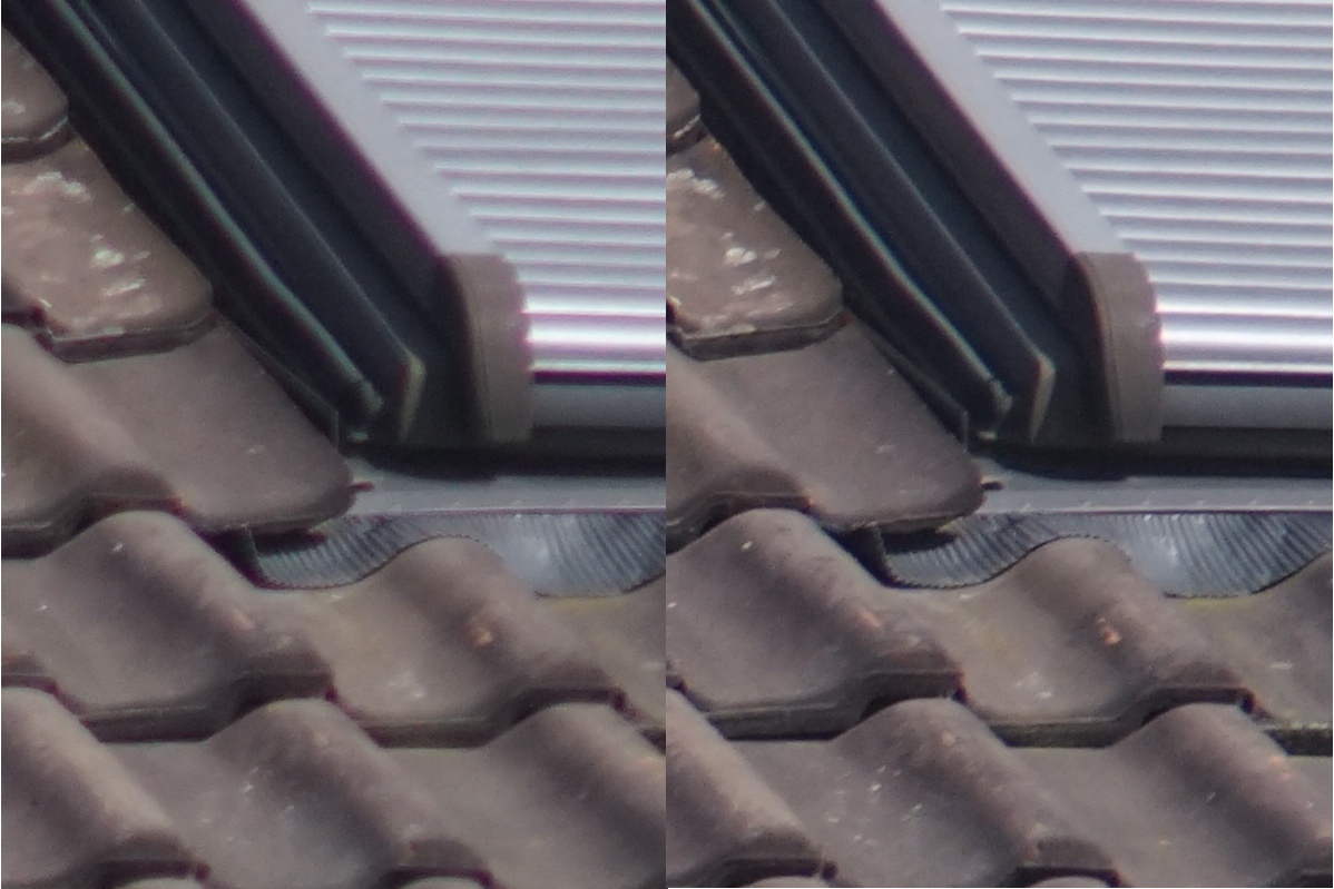Nun gibt es langweilige Bilder vom Dach eines entfernteren Nachbarn. Dabei habe ich jeweils einen Ausschnitt 599 x 799 Pixel aus der linken oberen Ecke und der Mitte genommen habe und bei Offenblende und um zwei Stufen abgeblendet fotografiert.Zunächst die Gesamtansicht: