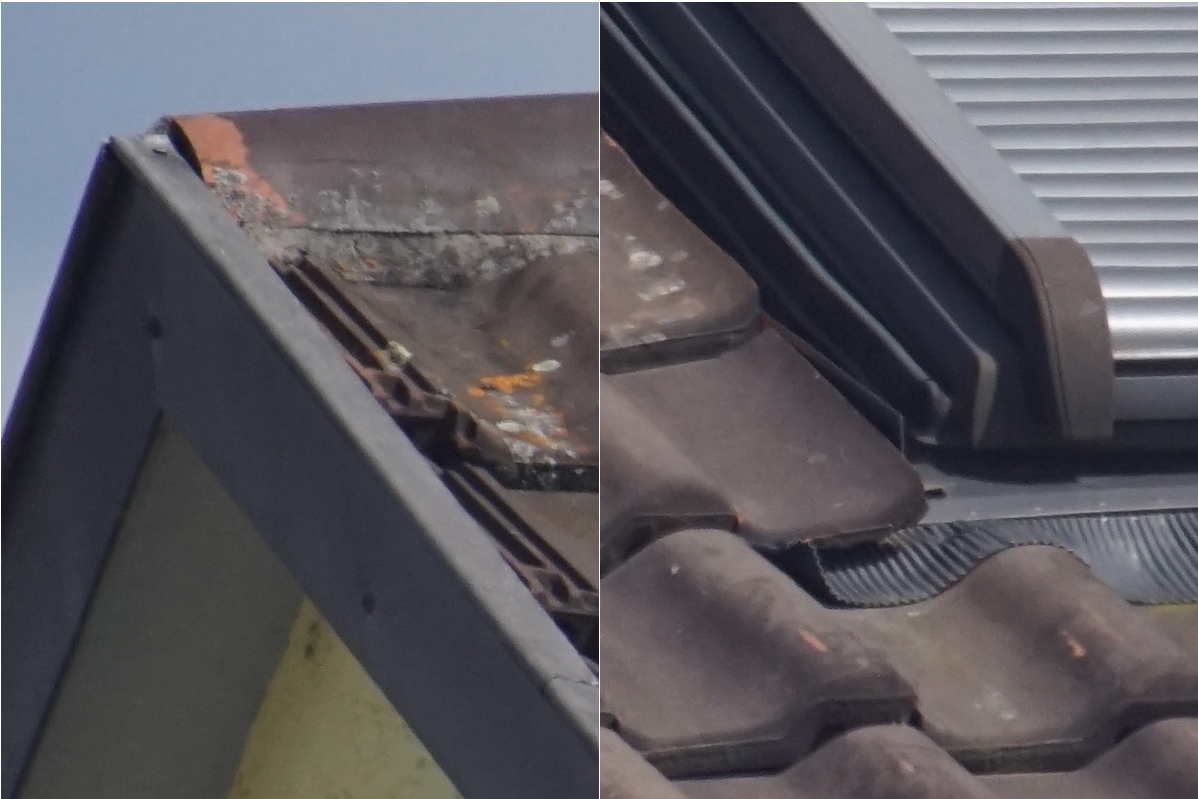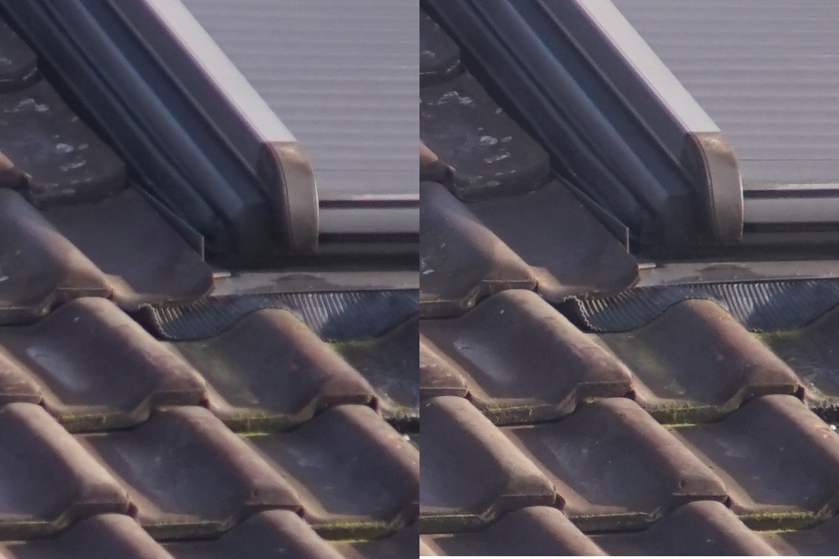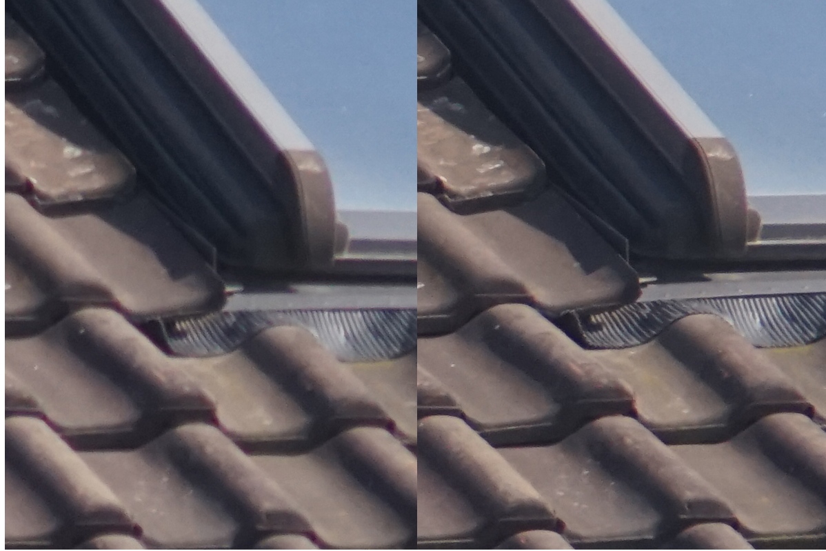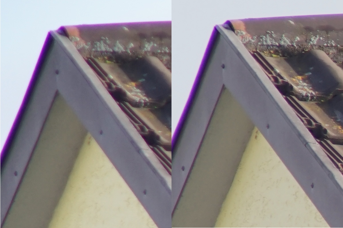 Nun gibt es langweilige Bilder vom Dach eines entfernteren Nachbarn. Dabei habe ich jeweils einen Ausschnitt 599 x 799 Pixel aus der linken oberen Ecke und der Mitte genommen habe und bei Offenblende und um zwei Stufen abgeblendet fotografiert.Zunächst die Gesamtansicht: