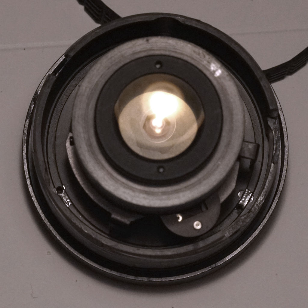 Da von außen nichts zu machen schien, habe ich versucht das Objektiv zu zerlegen. Mit mehreren Anläufen und Irrwegen habe ich nun den gesamten hinteren Teil entfernen können. Ebenso die kleineren Linsen vor den Blendlamellen. Die Verunreinigung war dort nicht zu finden. Also muss ich an die vorderen Linsen rankommen. Leider sind diese scheinbar fest in einem eigenen zylindrischen Gehäuse befestigt. Dies ist drehbar, dennoch fest mit dem vorderen Teil des Objektivs verbunden. Dieser Teil scheint auch in einem Guss mit dem Brand Ring verbunden zu sein.