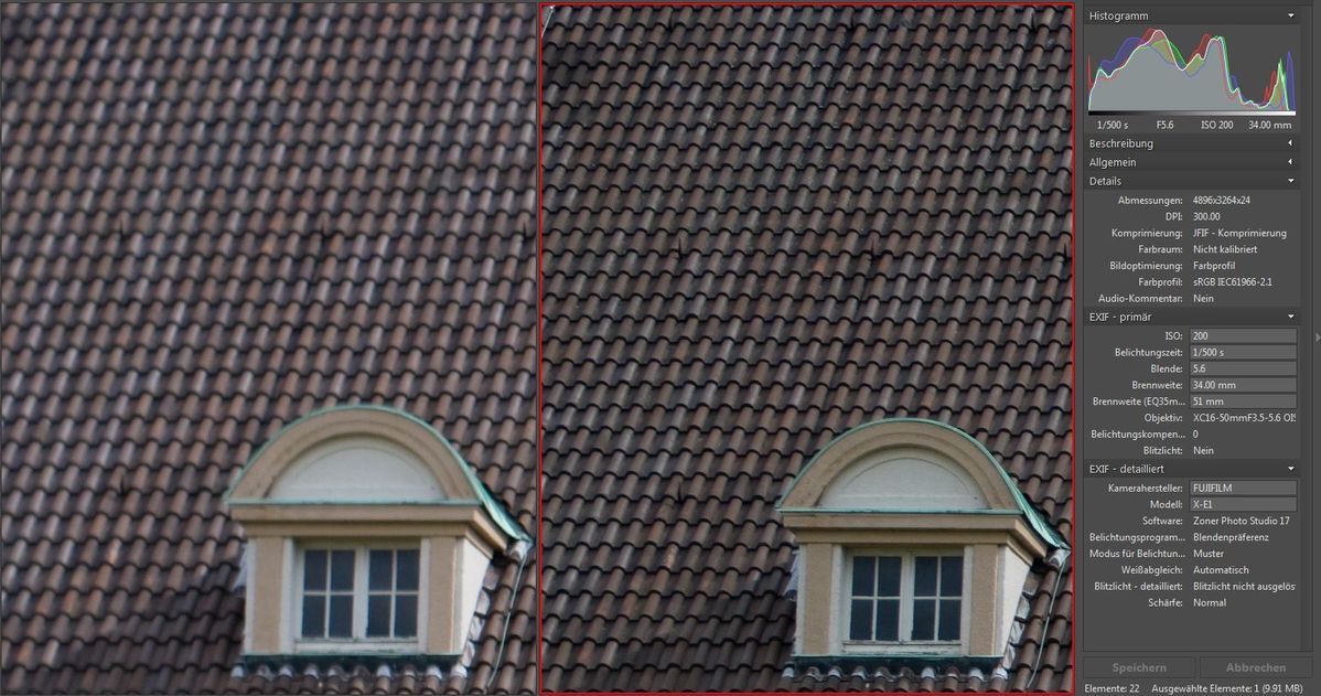 Auch hier noch einmal der Vergleich zum Kit-Zoom bei F5.6 (Kit ist rechts) :