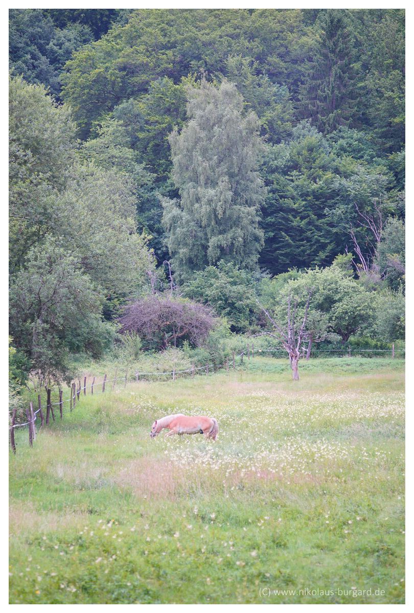 Schärfe bei Offenblende auf weitere Distanz (Fokus auf Pferd):