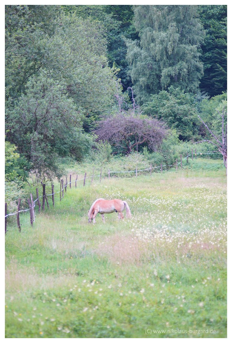 Schärfe bei Offenblende auf weite Distanz (fokussiert auf das Pferd):