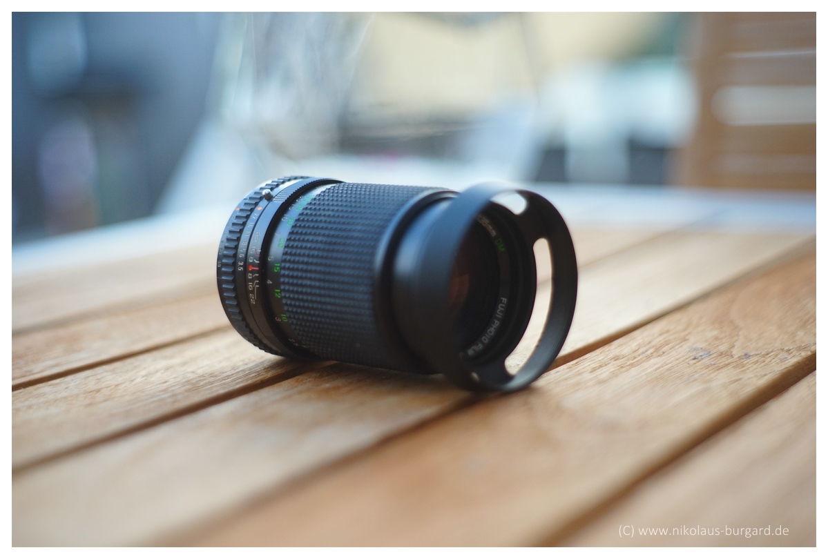 Das Objektiv hat das Fujica-X-Bajonett und stammt aus den 80ern.