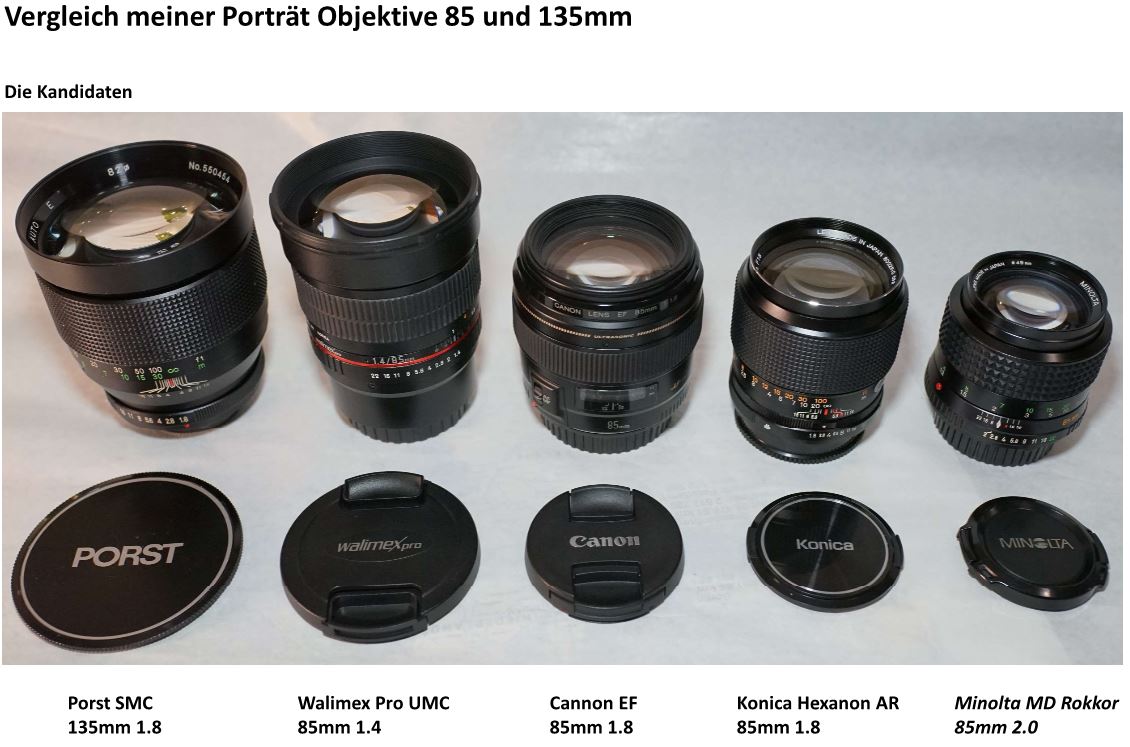 Vergleich Porträt-Objektive Minolta Rokkor 85mm, Konica 85mm, Canon 85mm, Walimex 85