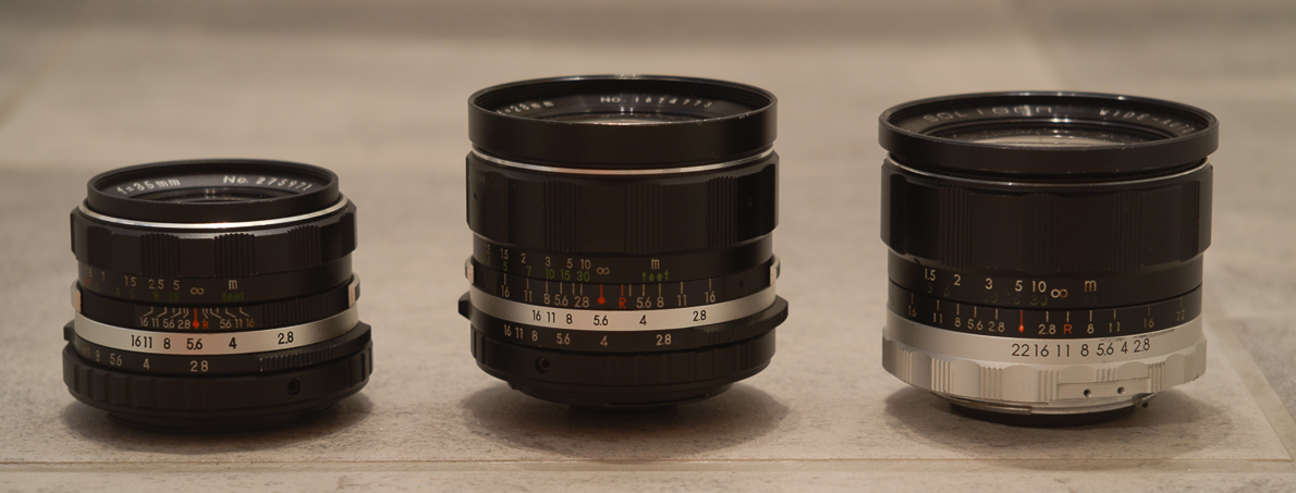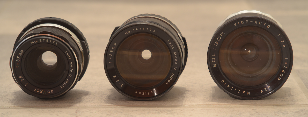 Hier sind alle drei hier erwähnten Soligor-Objektive zu sehen, links das 35/2,8 mit T2, in der Mitte das hier vorgestellte 28/2,8 mit T2 und rechts das 28/2,8 Wide Auto mit 62mm Filter und automatischer Springblende.