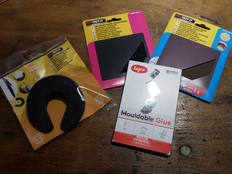 Selbstklebendes Antirutschgummi, 2mm dick, passt ziemlich gut, leicht mit Cutter oder Schere zu bearbeiten und hält ganz ordentlich.