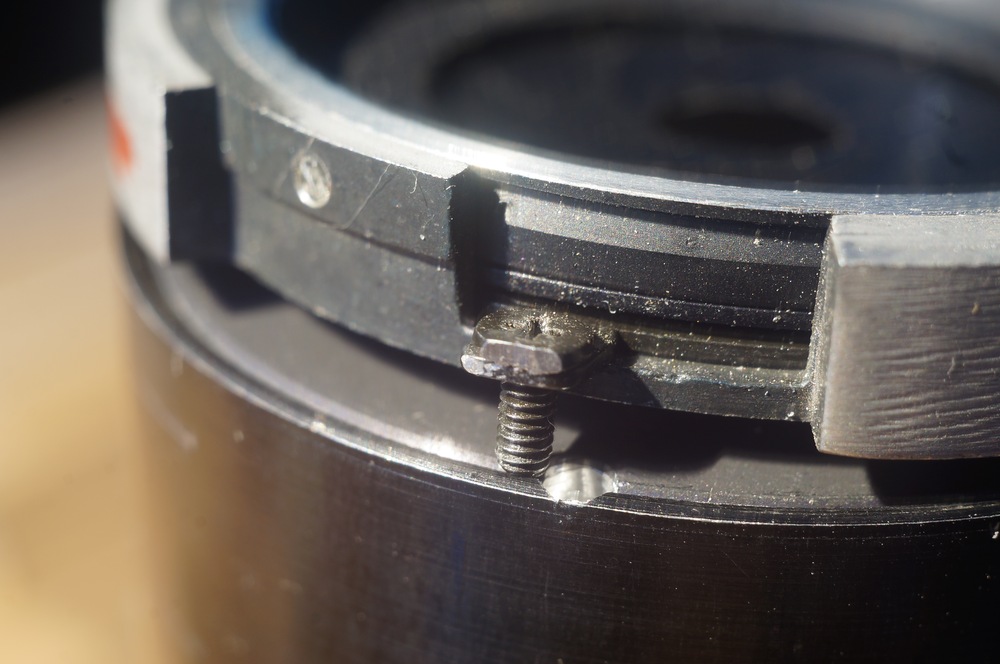 Das kleine Schräubchen wird in das neu gebohrte Loch der hinteren Linsengruppe versenkt.