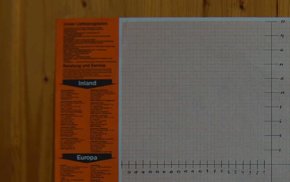 Blende eingebaut, offen, ein deutliche Brennweitenverkürzung ist sichtbar, Unschärfe am Rand wird heftig, Schärfezentrum wird etwas kleiner.