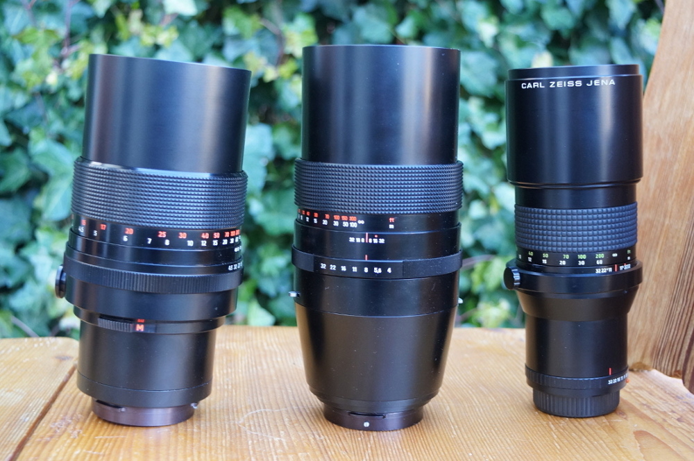 Hier ein Größenvergleich: links: Sonnar 4/300 MC, mitte: Sonnar 4/300 (wie Zebra aber schwarz), rechts: Prakticar 4/300 (letzte Bauform).