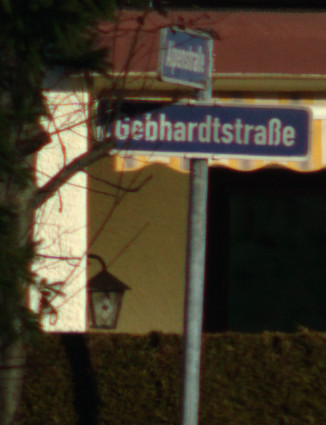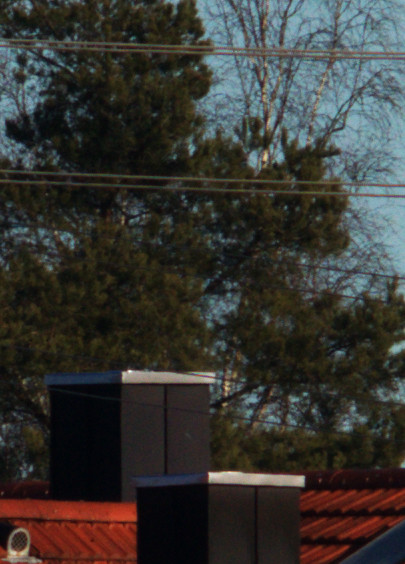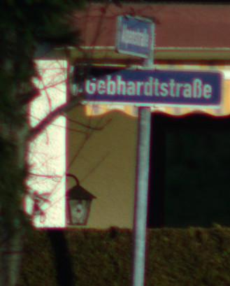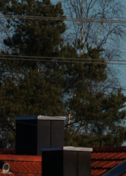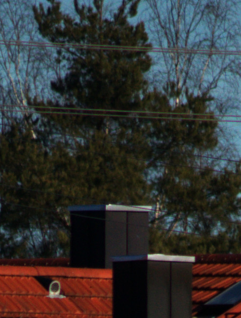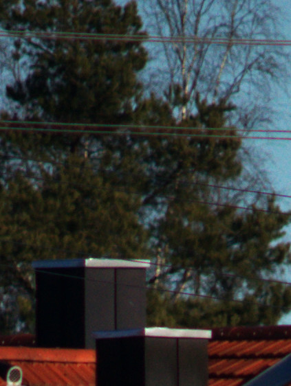 Um den Baum zeigen sich bei waagerechten Linien leichte grüne Ränder, die vielleicht vom Objektiv so gezeichnet werden. Diese sind jedoch mit Gimp betrachtet maximal 3 Pixel breit und damit im Rahmen der für Kleinbild “erlaubten” Unschärfe. Das heisst, dass das Objektiv für die für Kleinbildkameras empfohlene Schärfeanforderung verwendet werden kann. Auffällig ist aus meiner Sicht, dass die grünen Ränder im Bild nur bei waagrechten Linienabschnitten entstehen und nicht bei diagonalen Linien, sodass diese Ränder vielleicht auch andere Ursachen als nur die Abbildungseigenschaften des Objektivs haben.